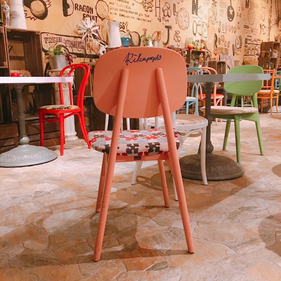 ということで、なんと椅子にサインさせていただきました。これから椅子に色んな方のサインが施されるということで、恐縮ながら第一号書かせていただきました。お店に行かれた際は、ピンクの椅子を探してみてください。